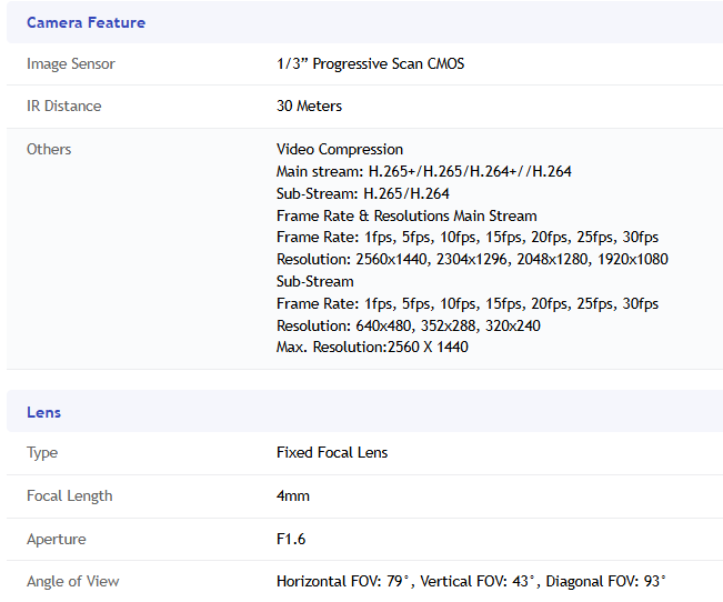 • Resolution: Max. 4MP (2560 x 1440) at 25 fps.